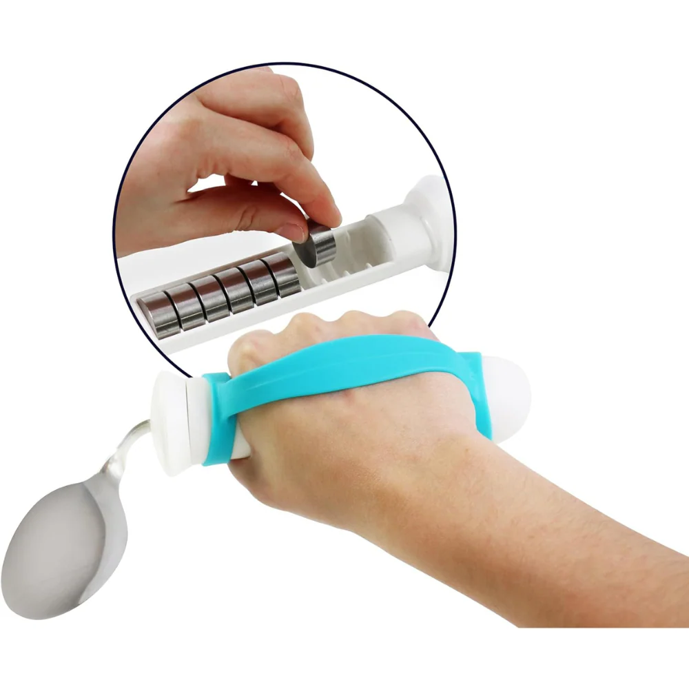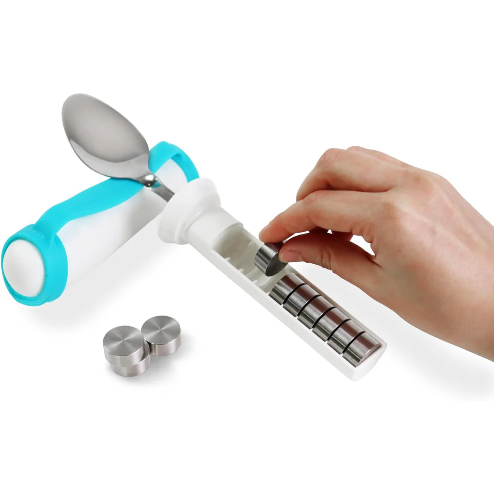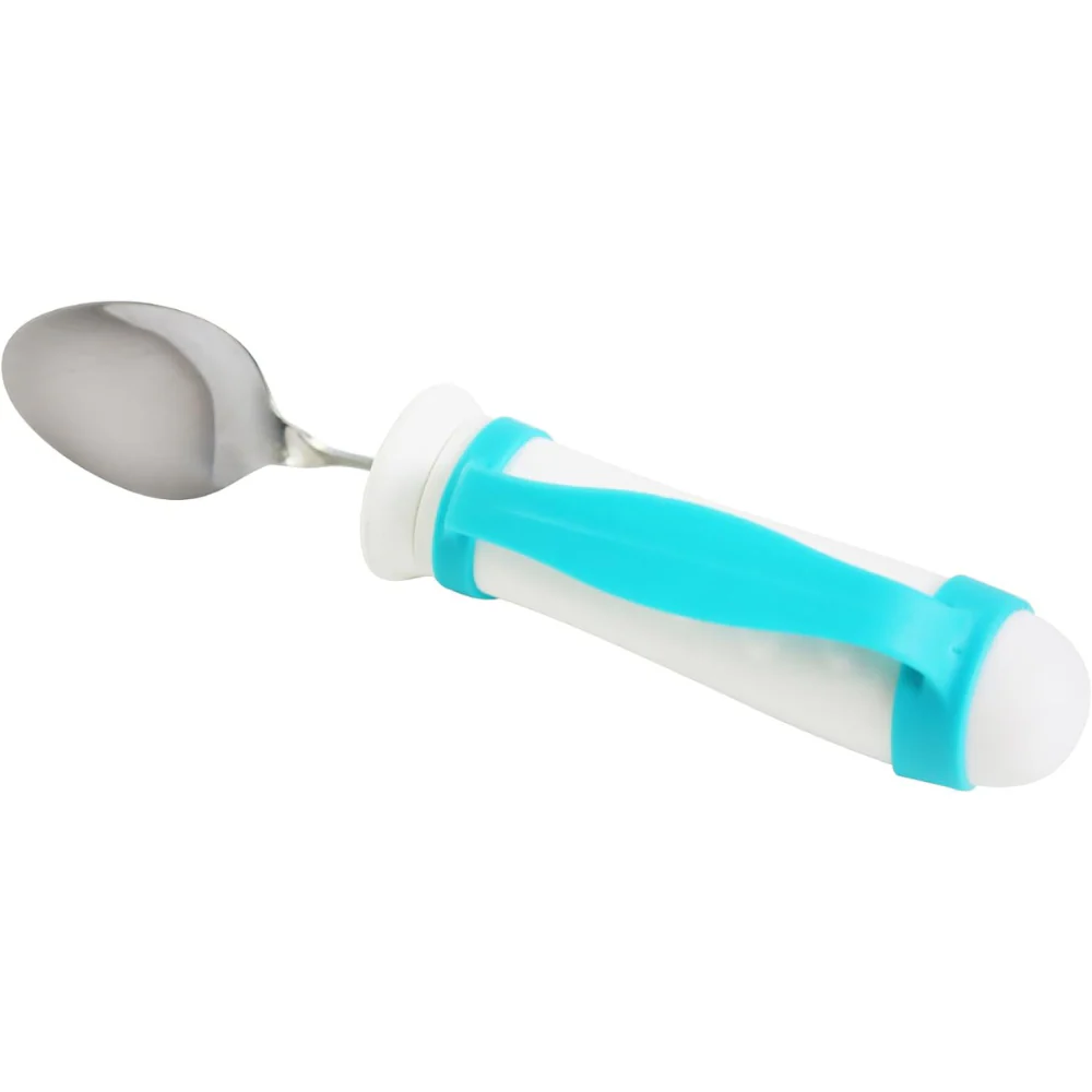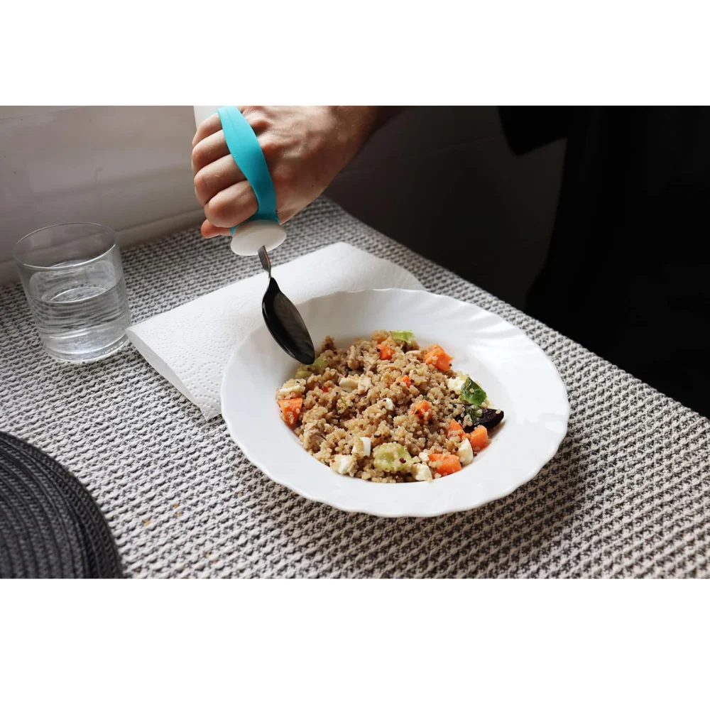En plus de la fonction de poids, le col de la cuillère est flexible, permettant d’ajuster l’angle jusqu’à 90 degrés pour s’adapter aux utilisateurs droitiers ou gauchers et à toute limitation de mouvement du poignet ou du bras. Le manche ergonomique et antidérapant, associé à la sangle en silicone, assure une prise ferme et confortable. C’est une aide technique inestimable pour les personnes atteintes de maladies neurologiques comme le Parkinson.