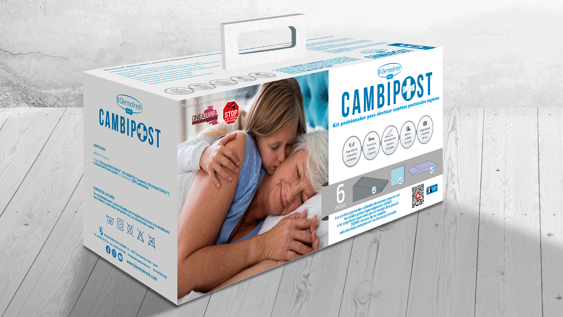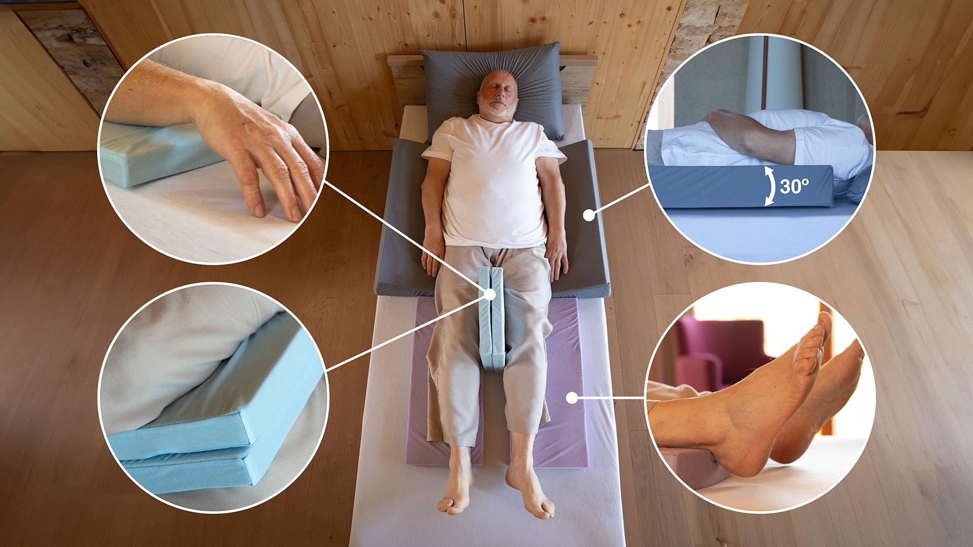 Ce système modulaire complet se compose de 6 positionneurs en mousse haute résilience, conçus pour alterner les points de pression et assurer une décharge posturale optimale. Chaque élément est protégé par une housse technologique  Health en fibres naturelles de Tencel™, enrichie en oxyde de zinc pour favoriser la régénération cutanée et offrir une protection antibactérienne permanente.