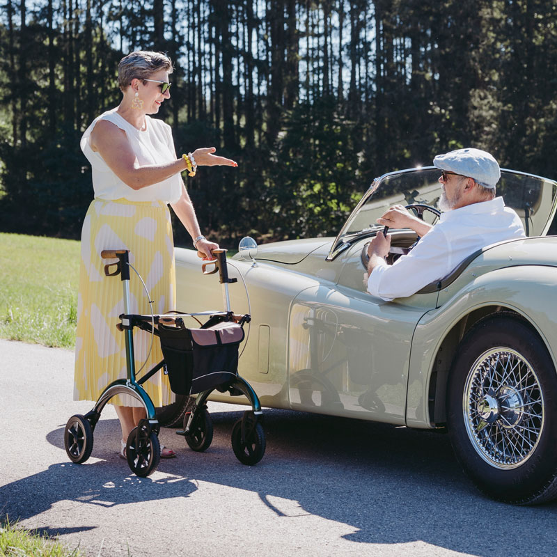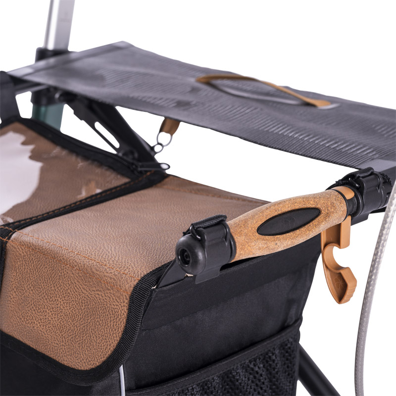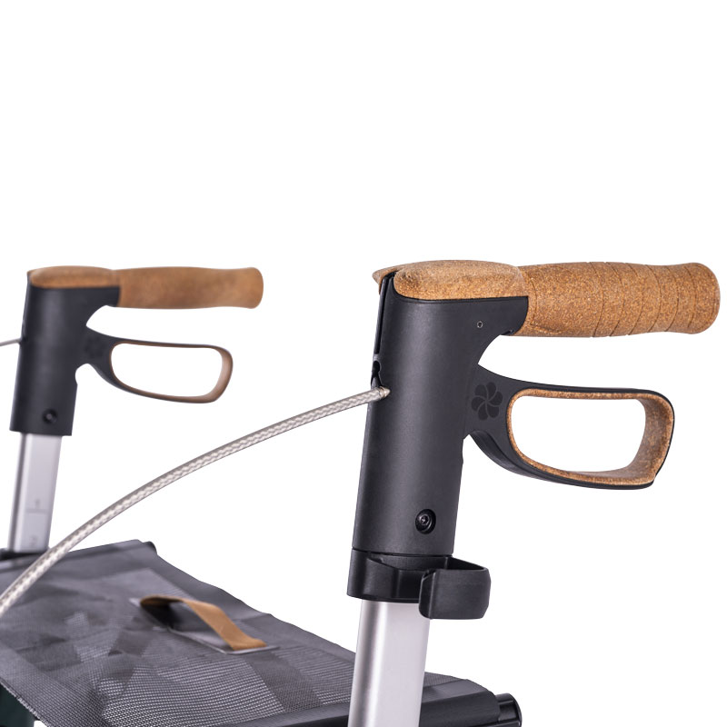 Le rollator carbone de Saljol dispose de caractéristiques premium. Il est muni de grandes roues très souples et absorbantes pour atténuer toutes les rugosités des chemins (25 cm de diamètre à l’avant). Les passe-trottoirs sont intelligemment positionnés pour faciliter le basculement du rollator. Le liège est utilisé pour les pièces de contact (poignées, freins, poignées de pliage), il absorbe les chocs et la chaleur, résiste aux UV et à l’abrasion, reste antidérapant même avec des mains humides.